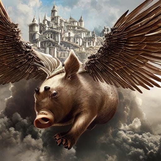 Bob knew that this was aerodynamically improbable. The lift generated by a flapping wing was a product of the density of the air, the surface area of the wing, and the square of the velocity of the creature in question. Given reasonable estimates for the mass and running speed of a pig, it would need at least 32 square feet of wing area to get airborne. This presented several possibilities, to wit: